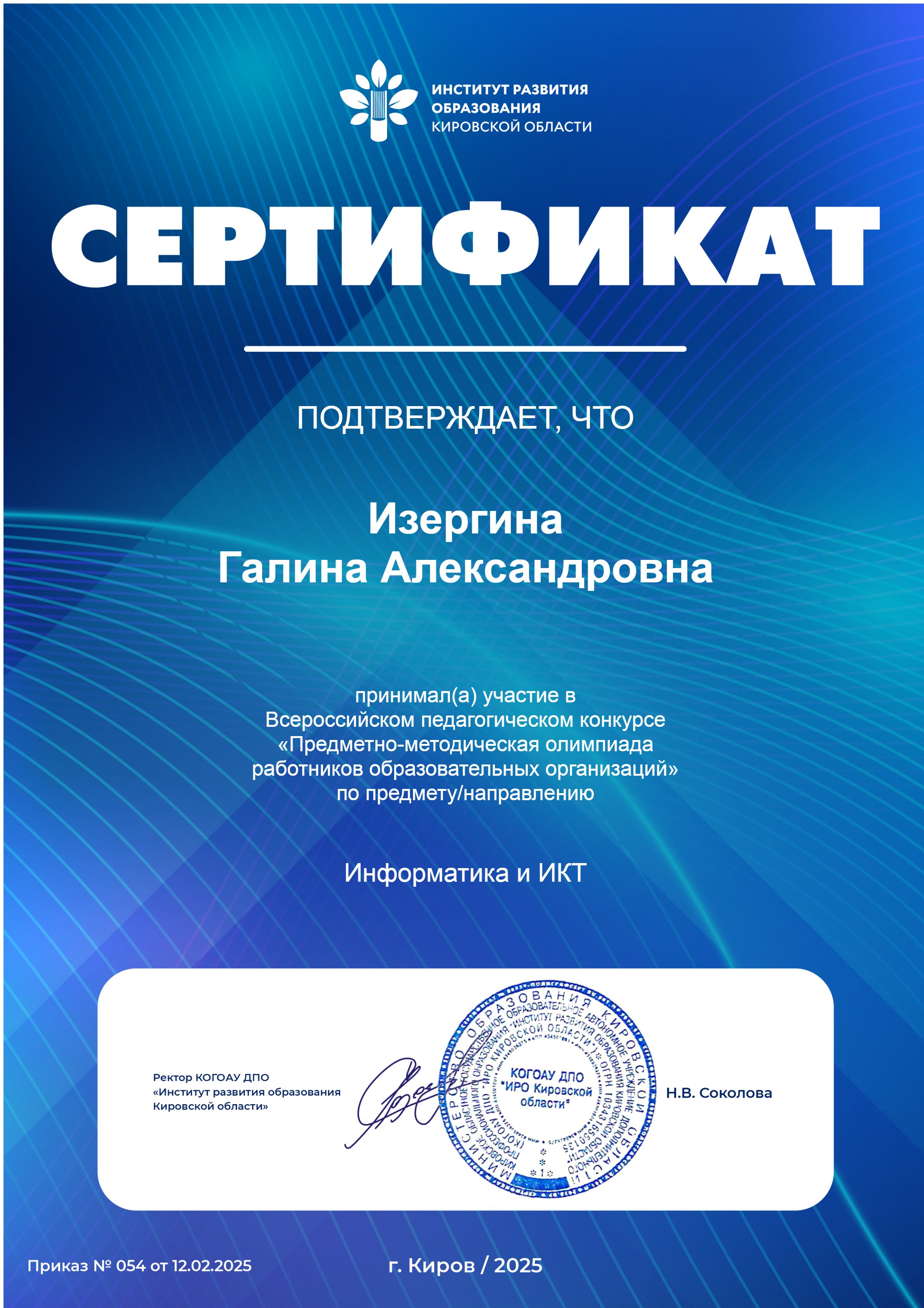 Сертификат участника Всероссийского педагогического конкурса "Предметно-методическая олимпиада работников образовательных организаций" по предмету/направлению Информатика