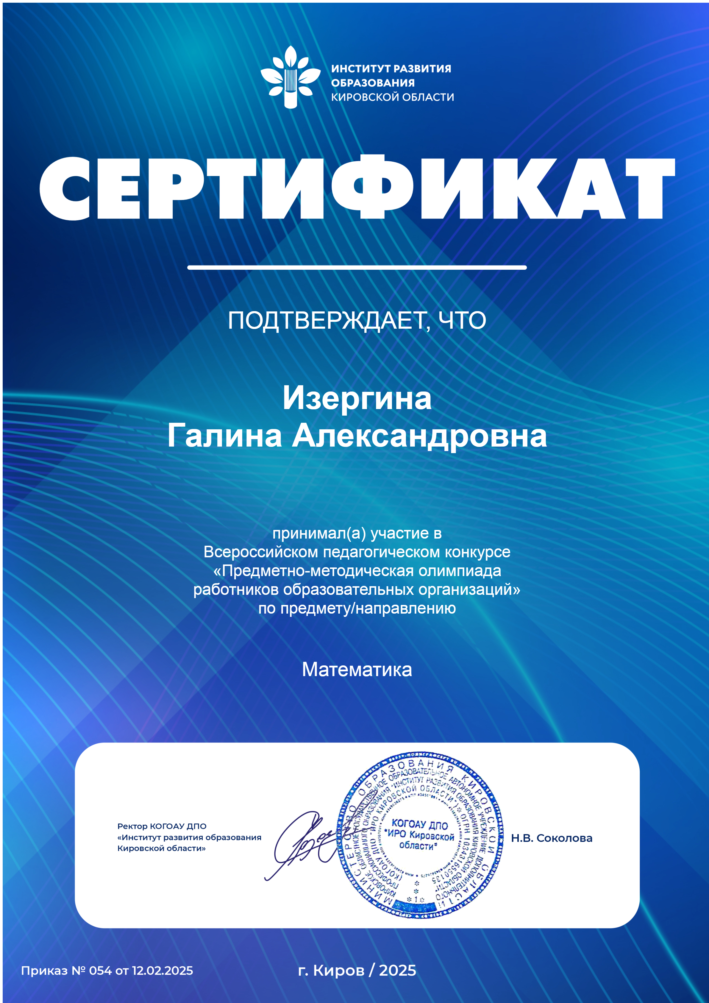 Сертификат участника Всероссийского педагогического конкурса "Предметно-методическая олимпиада работников образовательных организаций" по предмету/направлению Математика
