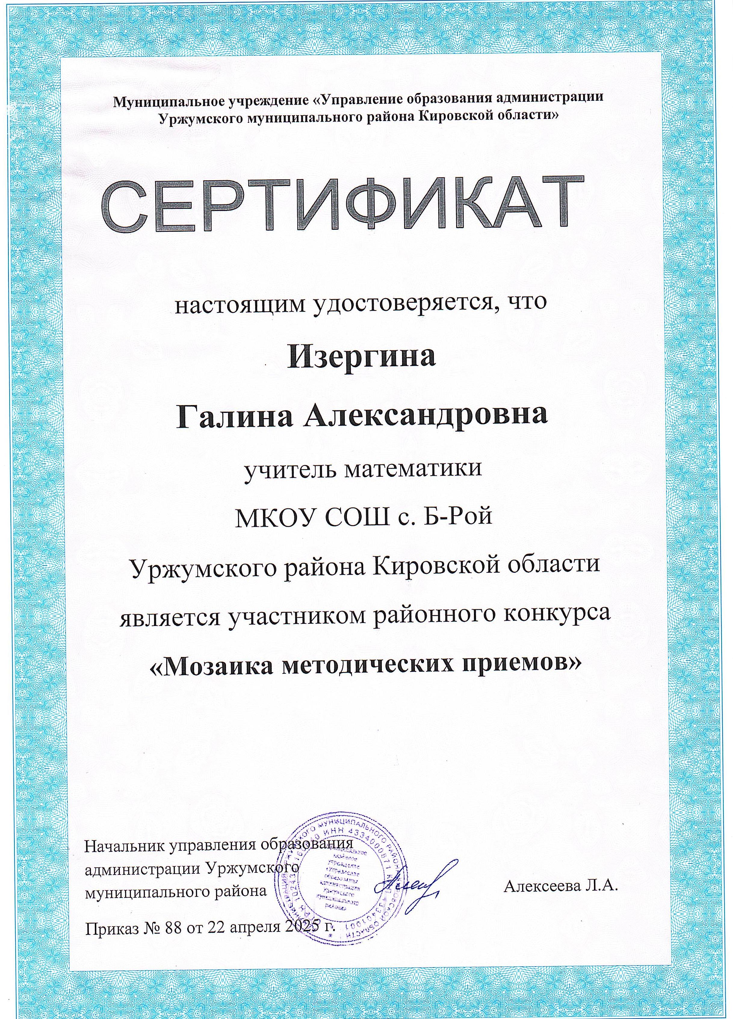 Сертификат участника районного конкурса "Мозаика методических приёмов"